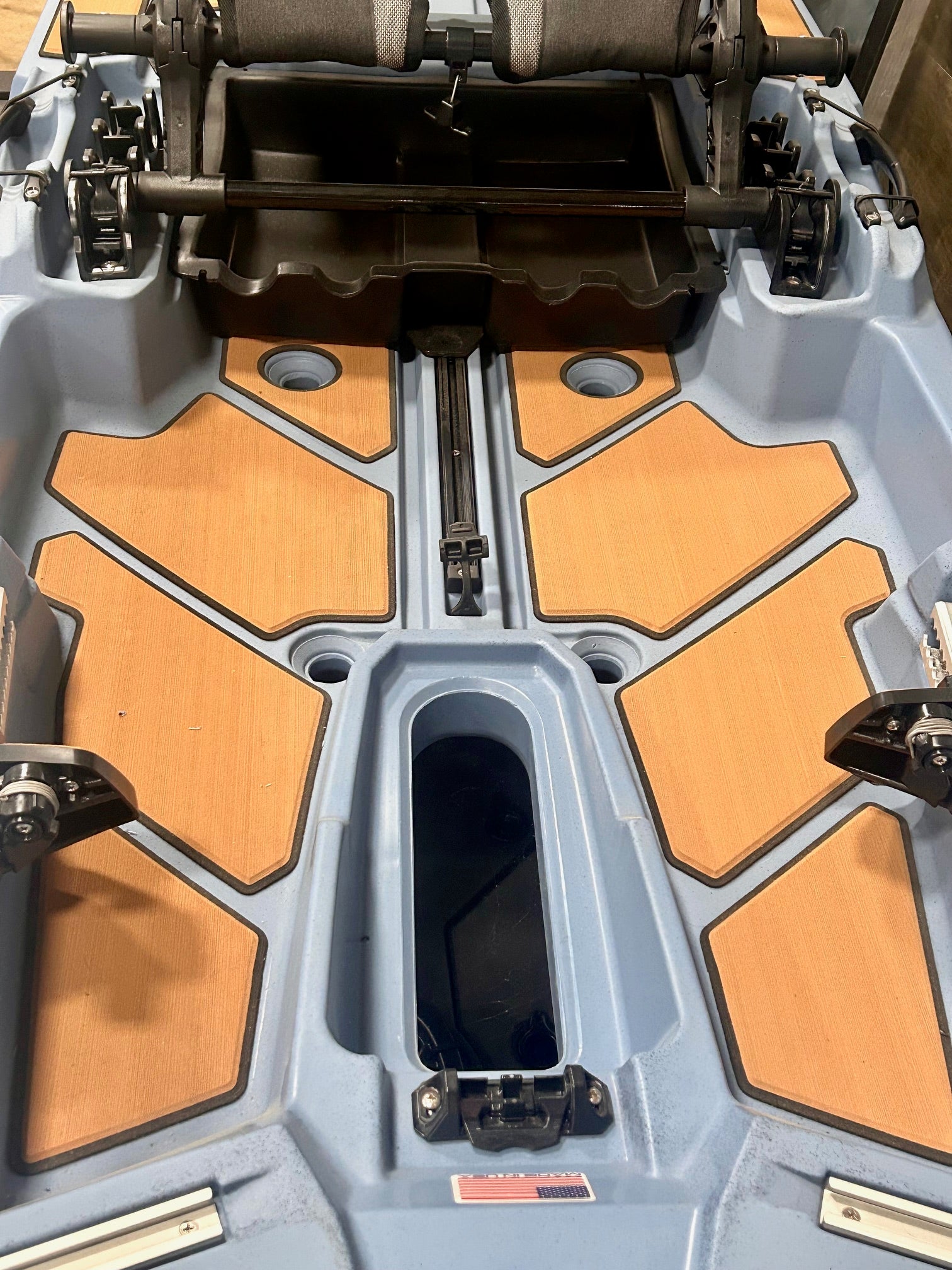 The grey deck traction with black outline is featured stock on the True Grit Sand, Hondo Orange, and Top Gun Grey colorways of the SS127 fishing kayak. Our traction pads are made from a UV resistant closed cell PE/EVA foam that is made to last. The deck traction aids in comfort and also helps limit noise when moving around or if items and lures are dropped on the deck of your kayak. An advantage of kayak fishing is the stealthy nature and the having high quality deck traction that comes stock on the SS series of kayaks is just one features that makes up Ultimate Fishability.